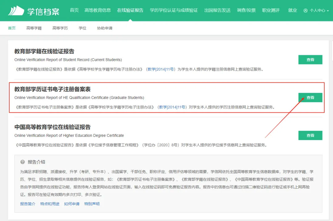 登錄進入學信網,【高等教育信息】、【在線驗證報告】可以根據自己的需求選擇。