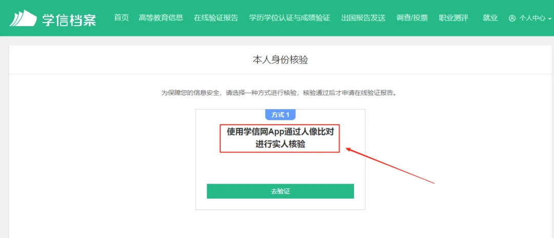 【高等教育信息】→【本人身份核驗】,有人像比對實人核驗、學業信息核驗兩種方式可以選擇。