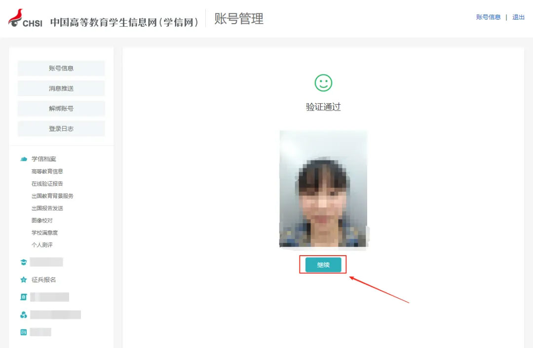 (1)人像比對實人核驗:點擊【去驗證】,確認身份信息,使用學信網App掃一掃進行實人驗證,驗證通過后點擊繼續。