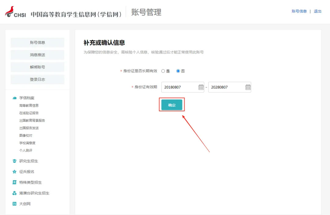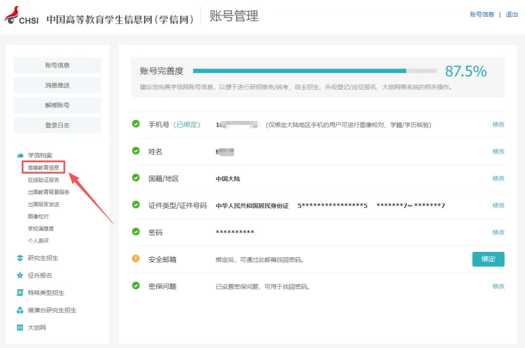 進入賬號信息頁面,點擊【高等教育信息】,查看學籍狀態,“不在籍(畢業/結業)”即可正常報考。
